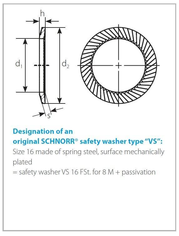 the standard safety washer type “S” is available for screws of sizes M1.6 to M36 and of the property classes up to 8.8. For screws of property classes 8.8 and 10.9, higher pretension forces might be necessary. These are covered by our reinforced washers type “VS”.